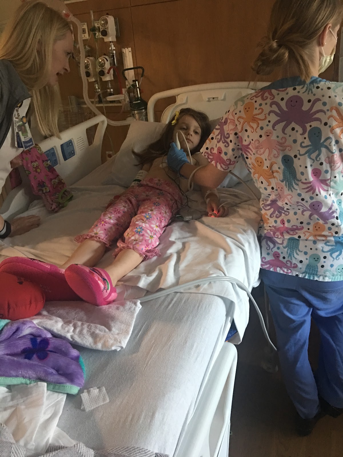 Trying to find the words to express how amazing this kid is would be next to impossible. Last night was the first time she really complained of pain (damn the chest tubes!) and she was given IV pain medicine and we had an ok night of sleep. But tonight, I'm sleeping in a bed with her and not a chair because we are out of the ICU!!! That 3am chest X-ray looked good this morning and the chest tubes came out around 8 after premedication. They have dissolvable stitches so we are now down to incisions that are on the path to healing without anything that has to be removed. The central line came out right after, this part was worse for her because of all the tape that ripped her skin raw. I will keep my comments on that to myself for now.